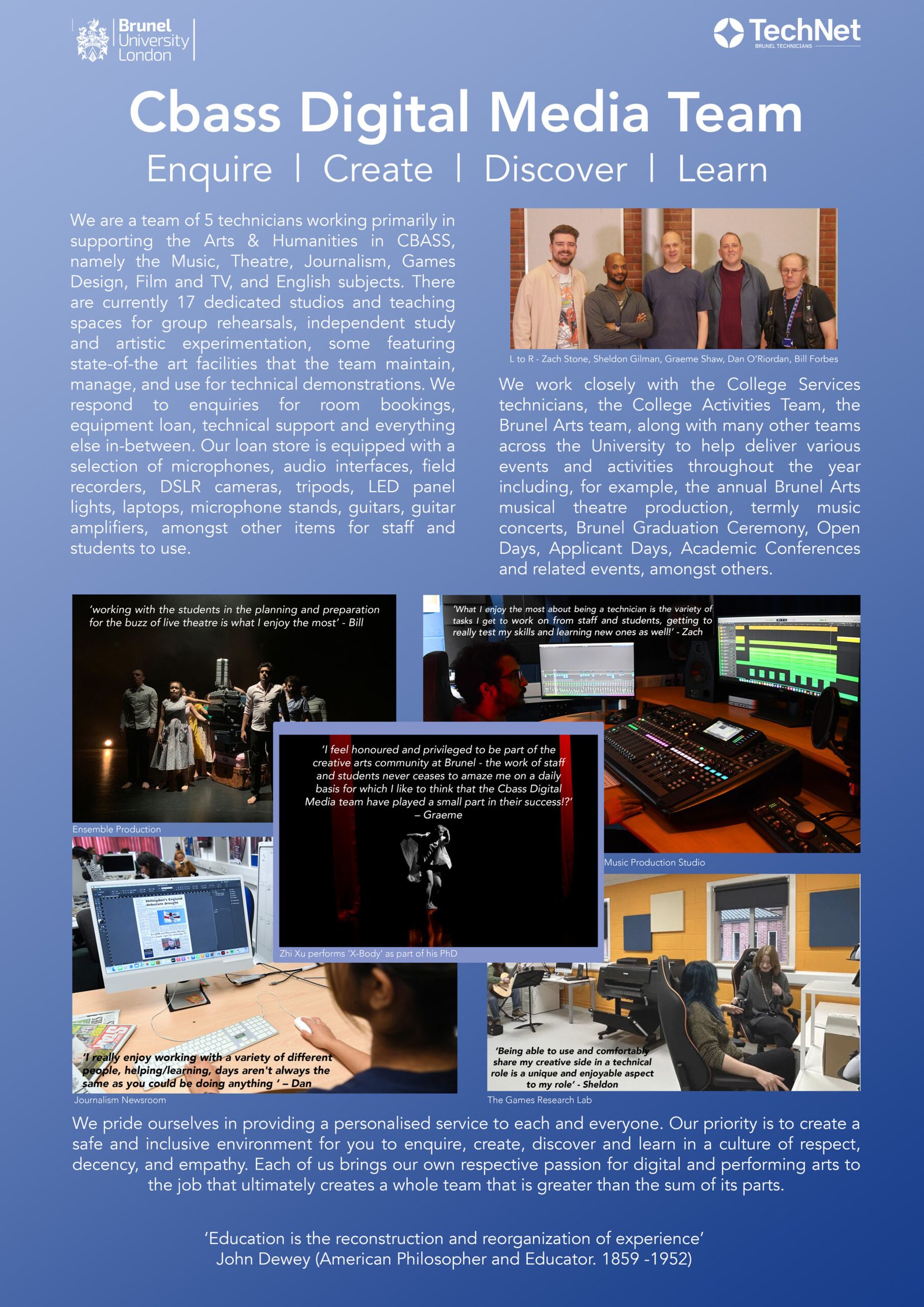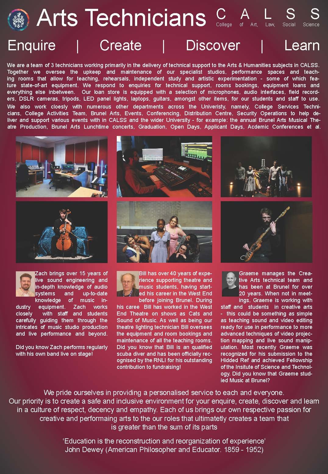 I am a Principal Technical Specialist (Arts) at Brunel University of London, where my role combines strategic oversight of the Technical Directorate while providing hands‑on technical expertise of music and theatre production. I oversee the alignment of creative arts technical education with current industry standards and lead a small specialist team that provides technical support across Arts & Humanities and Education subject areas. I also support performing arts events across the University and manage the budgets, resources, and technical infrastructure that enable high‑quality teaching, learning, and performance activities.